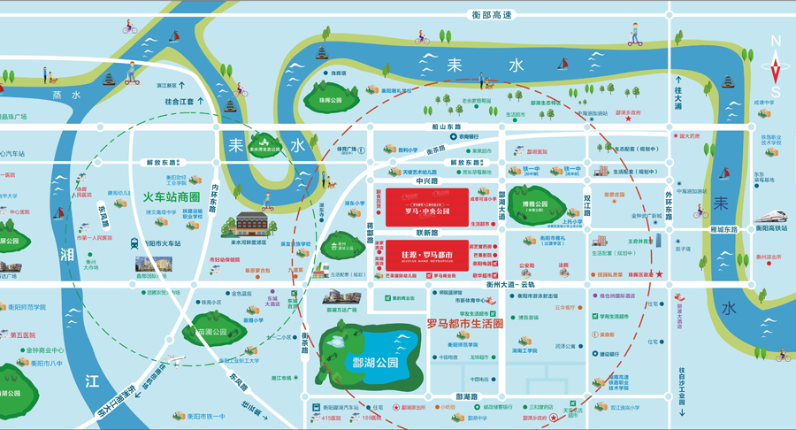 佳源酃湖都市项目雄踞酃湖新城核芯区域,依托衡州大道、酃湖大道(在建)、蒋酃路(在建)等酃湖新城核芯道路,能覆盖整个珠晖区。酃湖大道已于2022年动工建设,计划2024年完工,全部建成后向北将连接船山东路、雁城东路、衡茶路,交通便捷。项目对面毗邻酃湖万达观广场,紧邻衡阳市老牌名校铁一中,酃湖公园、新师院,工学院等环绕。