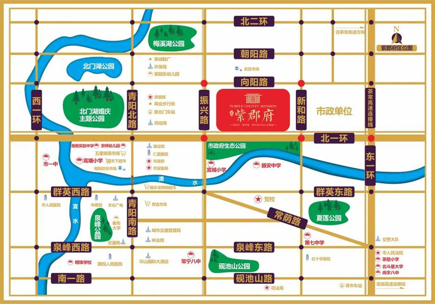 紫郡府项目是由常宁市亿嘉鸿置业有限公司打造的品质宜居大盘,项目位于常宁市北一环与东一环交汇处,总占地面积85亩,总建筑面积10万平方米,项目周边名校环绕,交通便利,且与500亩市政府生态公园仅一路之隔。