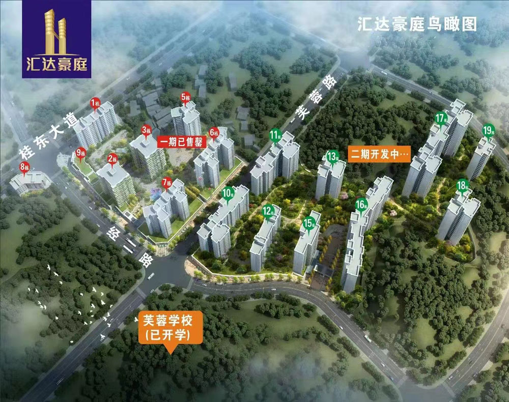汇达豪庭总占地面积104亩,建筑面积225900平方,容积率2.39,建筑密度达到18%以下,规划户数为1164户。项目分三期开发,一期开发面积为43亩,规划户数为380户,共由7栋电梯小高层组成,停车位460个。一期小区的人行主入口在经二路上,在桂东大道和小区南侧设有次出入口。在主入口旁边和桂东大道次出入口旁边各一个车库入口。