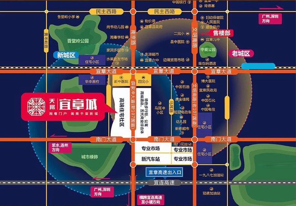 天邦·宜章城位于宜章县四完小与新中医院交汇处,项目总占地面积约1000亩,总建筑面积约150万平方。自建5万方市民文化广场、6万方大型商业综合体以及地标建筑摩天轮等,打造的吃、喝、玩、乐、购、娱、教于一体的现代化新型大都市。