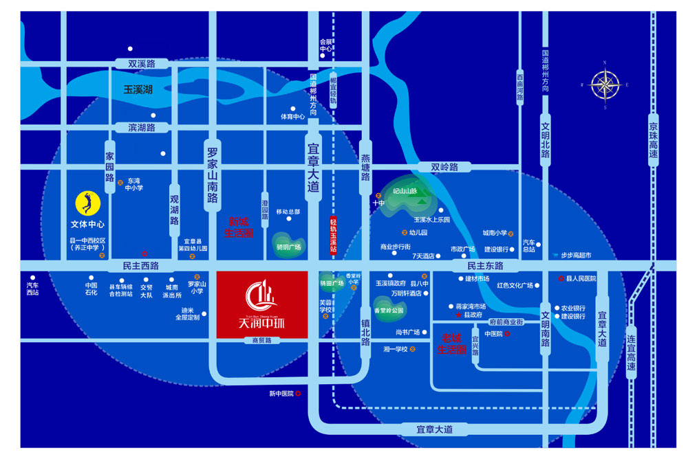 天润中环位于宜章大道与民主西路交汇处(骑玥广场对面),项目一期用地46亩,计容面积约13.8万㎡,其中商业配套约5万㎡。规划建设5栋住宅、5万㎡的集中商业,为宜章集吃、喝、玩、乐、购于一体的一站式城市综合体项目,可享受全方位居住生活服务。