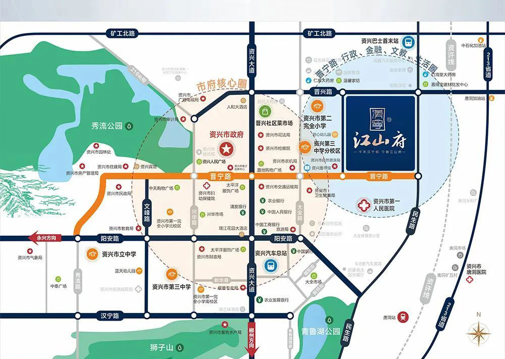 汉宁·江山府座落于资兴市晋宁路一号,占地约80亩,总建筑面积约20万平方,约1300户,开发商:资兴汇城房地产开发有限公司
